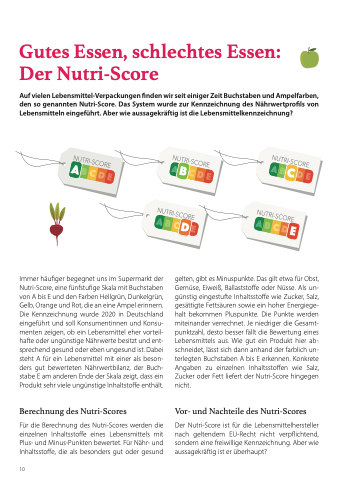 Immer häufiger begegnet uns im Supermarkt der Nutri-Score, eine fünfstufige Skala mit Buchstaben von A bis E und den Farben Hellgrün, Dunkelgrün, Gelb, Orange und Rot, die an eine Ampel erinnern. Die Kennzeichnung wurde 2020 in Deutschland eingeführt und soll Konsumentinnen und Konsu- menten zeigen, ob ein Lebensmittel eher vorteil- hafte oder ungünstige Nährwerte besitzt und ent- sprechend gesund oder eben ungesund ist. Dabei steht A für ein Lebensmittel mit einer als beson- ders gut bewerteten Nährwertbilanz, der Buch- stabe E am anderen Ende der Skala zeigt, dass ein Produkt sehr viele ungünstige Inhaltstoffe enthält.