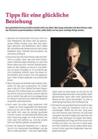 6. Wichtig für eine glückliche Partnerschaft ist aber auch, sich selbst als Individuum nicht zu ver- nachlässigen. Treffen Sie sich also ruhig auch mal ohne Partner oder Partnerin mit Freunden und gehen Sie einem Hobby nach, das Ihnen am Herzen liegt. Verzichten Sie wegen Ihrer Bezie- hung keinesfalls auf Dinge, die Ihnen sonst noch wichtig sind. Denn nur, wer sich in seiner eige- nen Haut wohlfühlt und sich selbst lieben kann, ist auch in der Lage, dem Gegenüber Liebe ent- gegenzubringen.