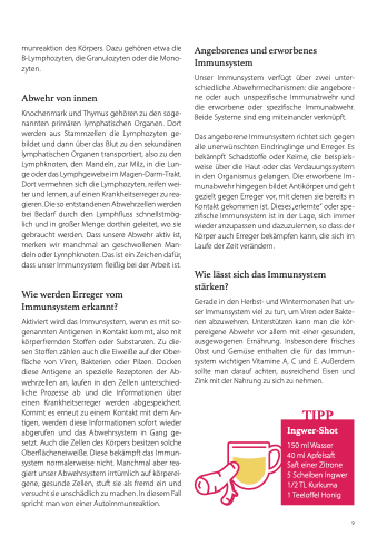 Gerade in den Herbst- und Wintermonaten hat un- ser Immunsystem viel zu tun, um Viren oder Bakte- rien abzuwehren. Unterstützen kann man die kör- pereigene Abwehr vor allem mit einer gesunden, ausgewogenen Ernährung. Insbesondere frisches Obst und Gemüse enthalten die für das Immun- system wichtigen Vitamine A, C und E. Außerdem sollte man darauf achten, ausreichend Eisen und Zink mit der Nahrung zu sich zu nehmen.
