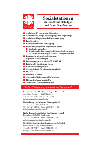 13Sozialstationenim Landkreis Ostallgäuund Stadt KaufbeurenSozialstation Buchloe-Germaringen-Pforzen e.V.Am Alten Eisplatz 1, 86807 BuchloeTel. 0 82 41/41 60 · Fax 0 82 41/13 46info@sozialstation-buchloe.deKath.-Evang. Sozialstation Füssen gGmbHAm Ziegelstadel 12, 87629 FüssenTel. 0 83 62/9 17 10 · Fax 0 83 62/9 17 11 28info@sozialstation-fuessen.deKath.-Evang. Sozialstation Kaufbeuren gGmbHEspachstr. 16, 87600 KaufbeurenTel. 0 83 41/95 22 0 · Fax 0 83 41/95 22 30info@sozialstation-kaufbeuren.deKirchliche Sozialstation Marktoberdorf gGmbHGreitherrstr. 8, 87616 MarktoberdorfTel. 0 83 42/9 84 47 · Fax 0 83 42/9 84 43info@kirchliche-sozialstation-mod.de■ Ambulante Kranken- und Altenpflege■ Vollstationäre Pflege, Kurzzeitpflege und Tagespflege■ Ambulante Hospiz- und Palliativversorgung■ Familienpflege■ Hauswirtschaftliche Versorgung■ Entlastung pflegender Angehöriger durch■ Verhinderungspflege■ Stundenweise Betreuung im Rahmen der Leistungen für Menschen mit eingeschränkter Alltagskompetenz■ Beratung in allen pflegerischen undallgemein sozialen Fragen■ Beratungsgespräche nach § 37.3 SGB XI■ Individuelle Beratung zu Hause■ Hauskrankenpflegekurse■ Gesprächskreis für pflegende Angehörige■ Menü Service■ Betreutes Wohnen■ Alternative Wohnformen für Senioren■ Pflegenotruf rund um die Uhr■ Zertifizierte HausnotrufanbieterRufen Sie uns an, wir beraten Sie gerne!