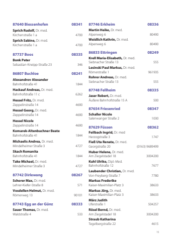 1587640 Biessenhofen 08341Sprich Rudolf, Dr. med.Kirchenstraße 1 a 4700Sprich Sabine, Dr. med.Kirchenstraße 1 a 470087737 Boos 08335Bonk PeterSebastian-Kneipp-Straße 23 34686807 Buchloe 08241Alexandrov AlexanderBahnhofstraße 41 1844Hackauf Andreas, Dr. med. Bahnhofstraße 11 c 6262Hessel Fritz, Dr. med. Zeppelinstraße 14 4690 Hessel Georg, Dr. med. Zeppelinstraße 14 4690Hessel NicoleZeppelinstraße 14 4690Komarek-Altenbuchner BeateBahnhofstraße 41 1844 Michaelis Andrea, Dr. med. Mindelheimer Straße 3 4727 Skach RomanitaBahnhofstraße 41 1844Take Michael, Dr. med. Mindelheimer Straße 3 472787742 Dirlewang 08267Schorer Max, Dr. med. Lehrer-Kiefer-Straße 8 571Vosdellen Helmut, Dr. med. Römerweg 13 9010187743 Egg an der Günz 08333Sauer Thomas, Dr. med. Waldstraße 4 53387746 Erkheim 08336 Martin Heike, Dr. med. Alpenweg 6 80490 Weidlich Kathrin, Dr. med. Alpenweg 6 80490 86833 Ettringen 08249Krell Maria-Elisabeth, Dr. med. Siebnacher Straße 13 555Lesinski Paul Markus, Dr. med. Römerstraße 1 961935 Rohrer Andreas, Dr. med. Siebnacher Straße 13 55587748 Fellheim 08335Jaser Robert, Dr. med. Äußere Bahnhofstraße 15 A 50087654 Friesenried 08347Schaller NicoleSalenwanger Straße 2 103087629 Füssen 08362Feilbach Ingrid, Dr. medHerzogstraße 3 1747Fieß Uta Renate, Dr. med. Georgstraße 20 (0163) 9689499Huber Helene, Dr. med. Am Ziegelstadel 18 3004200Kuhl Ulrike, Dipl.-Med. Bahnhofstraße 12 7677 Laubender Christian, Dr. med. Von-Freyberg-Straße 7 7780Markus FrederikeKaiser-Maximilian-Platz 3 38633 Markus Jörg, Dr. med.Kaiser-Maximilian-Platz 3 38633März JudithUferstraße 1 504257Rösel Bernd, Dr. med. Am Ziegelstadel 18 3004200Straub KatharinaTegelbergstraße 22 4615