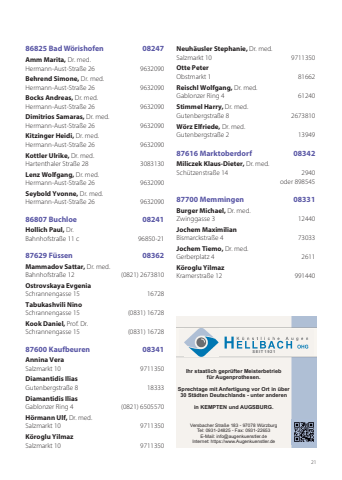 2186825 Bad Wörishofen 08247Amm Marita, Dr. med. Hermann-Aust-Straße 26 9632090Behrend Simone, Dr. med.Hermann-Aust-Straße 26 9632090Bocks Andreas, Dr. med. Hermann-Aust-Straße 26 9632090Dimitrios Samaras, Dr. med. Hermann-Aust-Straße 26 9632090 Kitzinger Heidi, Dr. med. Hermann-Aust-Straße 26 9632090Kottler Ulrike, Dr. med.Hartenthaler Straße 28 3083130Lenz Wolfgang, Dr. med.Hermann-Aust-Straße 26 9632090Seybold Yvonne, Dr. med. Hermann-Aust-Straße 26 963209086807 Buchloe 08241Hollich Paul, Dr.Bahnhofstraße 11 c 96850-2187629 Füssen 08362Mammadov Sattar, Dr. med.Bahnhofstraße 12 (0821) 2673810 Ostrovskaya EvgeniaSchrannengasse 15 16728Tabukashvili NinoSchrannengasse 15 (0831) 16728Kook Daniel, Prof. Dr. Schrannengasse 15 (0831) 1672887600 Kaufbeuren 08341Annina VeraSalzmarkt 10 9711350Diamantidis IliasGutenbergstraße 8 18333Diamantidis IliasGablonzer Ring 4 (0821) 6505570Hörmann Ulf, Dr. med. Salzmarkt 10 9711350Köroglu YilmazSalzmarkt 10 9711350 Neuhäusler Stephanie, Dr. med. Salzmarkt 10 9711350Otte PeterObstmarkt 1 81662Reischl Wolfgang, Dr. med.Gablonzer Ring 4 61240 Stimmel Harry, Dr. med.Gutenbergstraße 8 2673810Wörz Elfriede, Dr. med.Gutenbergstraße 2 1394987616 Marktoberdorf 08342Miliczek Klaus-Dieter, Dr. med.Schützenstraße 14 2940oder 89854587700 Memmingen 08331Burger Michael, Dr. med.Zwinggasse 3 12440 Jochem MaximilianBismarckstraße 4 73033 Jochem Tiemo, Dr. med.Gerberplatz 4 2611 Köroglu YilmazKramerstraße 12 991440 Ihr staatlich geprüfter Meisterbetrieb für Augenprothesen.Sprechtage mit Anfertigung vor Ort in über 30 Städten Deutschlands - unter anderenin KEMPTEN und AUGSBURG.Versbacher Straße 183 - 97078 WürzburgTel: 0931-24825 - Fax: 0931-22653E-Mail: info@augenkuenstler.deInternet: https://www.Augenkuenstler.deSEIT 1 9 2 1