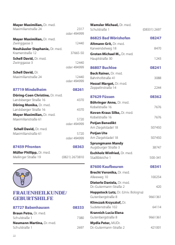 22Mayer Maximilian, Dr. med.Maximilianstraße 24 2317 oder 494999 Mayer Maximilian, Dr. med.Zwinggasse 3 12440 Neuhäusler Stephanie, Dr. med.Kramerstraße 12 37665-50Schell David, Dr. med.Zwinggasse 3 12440oder 494999 Schell David, Dr. Maximilianstraße 24 12440oder 49499987719 Mindelheim 08261Döring-Coen Christine, Dr. med.Landsberger Straße 16 4370Döring Monika, Dr. med.Landsberger Straße 16 4370Mayer Maximilian, Dr. med.Maximilianstraße 61 5720 oder 494999Schell David, Dr. med.Maximilianstraße 61 5720 oder 49499987459 Pfronten 08363Müller Phillipp, Dr. med.Meilinger Straße 19 (0821) 2673810FRAUENHEILKUNDE/GEBURTSHILFE87727 Babenhausen 08333Braun Petra, Dr. med.Schulstraße 1 7380 Neumann Martina, Dr. med.Schulstraße 1 2697Wamsler Michael, Dr. med.Schulstraße 1 (08331) 269786825 Bad Wörishofen 08247Altmann Grit, Dr. med.Karwendelweg 18 8470Groten Michael M., Dr. med.Hauptstraße 30 1243 86807 Buchloe 08241Beck Rainer, Dr. med.Bahnhofstraße 41 3088Hessel Margot, Dr. med.Zeppelinstraße 14 2244 87629 Füssen 08362Böhringer Anne, Dr. med.Kobelstraße 16 7676Koven-Kraus Silke, Dr. med.Kobelstraße 16 7676Potjan BenediktAm Ziegelstadel 18 507450 Potjan UteAm Ziegelstadel 18 507450 Sprungmann MandyAugsburger Straße 3 38747Eschholz Winfried, Dr. med. Stadtbleiche 1 500-34187600 Kaufbeuren 08341Brecht Veronika, Dr. med.Alleeweg 10 100254 Dieterle Daniela, Dr. med. Dr.-Gutermann-Straße 2 420Hoppstock Lutz, Dr. (Univ. Bologna)Gutenbergstraße 8 9661361 Klimczak Krzysztof, Dr. Sudetenstraße 102 64114Krannich Lucia ElenaGutenbergstraße 8 9661361 Mydla Peter, MUDr. Dr.-Gutermann-Straße 2 421001