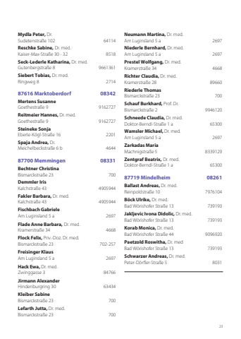 23Mydla Peter, Dr. Sudetenstraße 102 64114Reschke Sabine, Dr. med.Kaiser-Max-Straße 30 - 32 8518 Seck-Lederle Katharina, Dr. med.Gutenbergstraße 8 9661361 Siebert Tobias, Dr. med.Ringweg 8 271487616 Marktoberdorf 08342Mertens SusanneGoethestraße 9 9162727Reitmeier Hannes, Dr. med.Goethestraße 9 9162727 Steineke SonjaEberle-Kögl-Straße 16 2201Spaja Andrea, Dr. Meichelbeckstraße 6 b 4644 87700 Memmingen 08331Bechtner ChristinaBismarckstraße 23 700Demmler IrisKalchstraße 43 4905944 Fakler Barbara, Dr. med.Kalchstraße 43 4905944Fischbach GabrieleAm Luginsland 5 a 2697 Flade Anne Barbara, Dr. med.Kramerstraße 34 4668Flock Felix, Priv.-Doz. Dr. med. Bismarckstraße 23 702-257Freisinger KlausAm Luginsland 5 a 2697 Hack Ewa, Dr. med.Zwinggasse 3 84766Jirmann AlexanderHindenburgring 30 63434 Kleiber SabineBismarckstraße 23 700Lefarth Jutta, Dr. med.Bismarckstraße 23 700Neumann Martina, Dr. med.Am Luginsland 5 a 2697 Niederle Bernhard, Dr. med.Am Luginsland 5 a 2697Prestel Wolfgang, Dr. med.Kramerstraße 34 4668 Richter Claudia, Dr. med.Kramerstraße 28 89660 Riederle ThomasBismarckstraße 23 700 Schauf Burkhard, Prof. Dr. Bismarckstraße 2 9946120 Schneede Claudia, Dr. med.Doktor-Berndl-Straße 1 a 65300 Wamsler Michael, Dr. med.Am Luginsland 5 a 2697Zarkadas MariaMachnigstraße 5 8339129Zentgraf Beatrix, Dr. med.Doktor-Berndl-Straße 1 a 6530087719 Mindelheim 08261Ballast Andreas, Dr. med.Reinpoldstraße 10 7976104Böck Ulrike, Dr. med.Bad Wörishofer Straße 13 739193Jakljevic Ivona Didolic, Dr. med.Bad Wörishofer Straße 13 739193Korab Monica, Dr. med.Bad Wörishofer Straße 44 9096920 Paetzold Roswitha, Dr. medBad Wörishofer Straße 13 739193Schwarzer Andreas, Dr. med.Peter-Dörfler-Straße 5 8031