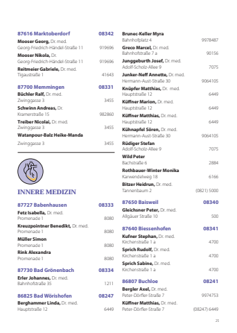 2587616 Marktoberdorf 08342Mooser Georg, Dr. med.Georg-Friedrich-Händel-Straße 11 919696 Mooser Nikola, Dr. Georg-Friedrich-Händel-Straße 11 919696Reitmeier Gabriele, Dr. med.Tigaustraße 1 4164387700 Memmingen 08331Büchler Ralf, Dr. med.Zwinggasse 3 3455 Schwinn Andreas, Dr. Kramerstraße 15 982860 Treiber Nicolai, Dr. med.Zwinggasse 3 3455 Watanpour-Balz Heike-MandaZwinggasse 3 3455INNERE MEDIZIN87727 Babenhausen 08333Fetz Isabella, Dr. med.Promenade 1 8080Kreuzpointner Benedikt, Dr. med.Promenade 1 8080Müller SimonPromenade 1 8080Rink AlexandraPromenade 1 808087730 Bad Grönenbach 08334Erler Johannes, Dr. med. Bahnhofstraße 35 121186825 Bad Wörishofen 08247Berghammer Linda, Dr. med.Hauptstraße 12 6449 Brunec-Keller Myra Bahnhofplatz 4 9978487 Greco Marcel, Dr. med.Bahnhofstraße 7 a 90156 Junggeburth Josef, Dr. med. Adolf-Scholz-Allee 9 7075Junker-Neff Annette, Dr. med. Hermann-Aust-Straße 30 9064105Knüpfer Matthias, Dr. med.Hauptstraße 12 6449 Küffner Marion, Dr. med.Hauptstraße 12 6449 Küffner Matthias, Dr. med.Hauptstraße 12 6449 Kühnapfel Sören, Dr. med. Hermann-Aust-Straße 30 9064105Rüdiger StefanAdolf-Scholz-Allee 9 7075Wild PeterBachstraße 6 2884Rothbauer-Winter MonikaKarwendelweg 18 6166Bitzer Heidrun, Dr. med. Tannenbaum 2 (0821) 500087650 Baisweil 08340Gleichsner Peter, Dr. med.Allgäuer Straße 10 50087640 Biessenhofen 08341Kufner Stephan, Dr. med.Kirchenstraße 1 a 4700Sprich Rudolf, Dr. med.Kirchenstraße 1 a 4700Sprich Sabine, Dr. med.Kirchenstraße 1 a 470086807 Buchloe 08241Bergler Axel, Dr. med. Peter-Dörfler-Straße 7 9974753Küffner Matthias, Dr. med. Peter-Dörfler-Straße 7 (08247) 6449