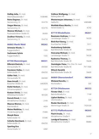27Helbig Julia, Dr. med.Meichelbeckstraße 7 9180480 Reins Dagmar, Dr. med.Siemensring 13 914770 Steger Marcus, Dr. med.Siemensring 13 914770Wanner Michael, Dr. med.Ruderatshofener Straße 55 95093Zoellner Victoria, Dr. med.Siemensring 13 91471086865 Markt Wald 08262Artmeier Nicole, Dr. Fuggerstraße 6 1555Sachmann SylviaFuggerstraße 6 155587700 Memmingen 08331Ellbrück Dietrich, Dr. med.Donaustraße 78 834300 Fensterer Heiko, Dr. med.Keltenstraße 10 834250Göller Veit, Dr. med.Donaustraße 78 834300 Haas Arnulf, Dr. med.Buxacher Straße 63 6403878 Kiefel Herbert, Dr. med.Schrannenplatz 8 5527Kratzer Ulrich, Dr. med.Wittelsbacherstraße 7 901020Kureck Knud, Dr. med.Mindelheimer Straße 2 2193Maurus Werner, Dr. med.Kalchstraße 8 4424Meine Matthias, Dr. med.Hindenburgring 30 73300Mozyk ElenaKeltenstraße 10 61646Schiefer Bernhard, Dr. med.Keltenstraße 10 834250Sperling EvaHerrenstraße 12 4282Vollmar Wolfgang, Dr. med.Kaisergraben 40 3142Westermayer Johannes, Dr. med. Hallhof 8 4985888Wohlleb Klaus Martin, Dr. med. Herrenstraße 12 42 82 87719 Mindelheim 08261Baumann Andreas, Dr. med.Landsberger Straße 11 76520 Böck Karl Georg, Dr. med.Krumbacher Straße 1 5511 Hackenberg GabrieleBad Wörishofer Straße 39 76630Honcamp Michael, Dr. med.Landsberger Straße 11 76520 Ryzlewicz Thomas, Dr.Bad Wörishofer Straße 39 76630Steinbigler Peter, Priv.-Doz. Dr. med. Bad Wörishofer Straße 44 797-7640Witsch HendrikBad Wörishofer Straße 39 7663086869 Oberostendorf 08344Wieland Karolin, Dr.Kirchstraße 5 50587724 Ottobeuren 08332Förster Olaf, Dr. med. Bahnhofstraße 8 a 7100 Lipfert Bettina, Dr. med.Ulrichstraße 6 326 Rieder Bernhard, Dr. med.Memminger Straße 31 792553087772 Pfaffenhausen 08265Flach Ursula, Dr. med.Mindelheimer Straße 9 96880Landgraf Susanne, Dr. med.Mindelheimer Straße 9 96880