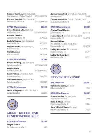 31Kutzner Jennifer, Dipl.-Sozialpäd. Carl-Maria-von-Weber-Straße 1 (0173) 9888758Kutzner Jennifer, Dipl.-Sozialpäd. Meichelbeckstraße 3 (0173) 988875887700 Memmingen 08331Botos Melania-Lilla, Dipl.-Päd. Lindentorstraße 12 (0152) 06343812Büttner TheresiaZangmeisterstraße 24 9748072Lederle Regina, Dipl.-Sozialpäd. Krautstraße 2 a 9256705 Michels Ursula, Dipl.-Sozialpäd. Kalchstraße 15 9292848Pieroth JoanaKalchstraße 15 6401364 87719 Mindelheim 08261Fowles Hedwig, Dipl.-Sozialpäd. Bahnhofstraße 20 (0175) 8460602Fowles MariaBahnhofstraße 20 (0175) 8460602Kühn Philipp, Dr. rer. biol. hum. Bahnhofstraße 43 7981722 Schertel Annette, Dipl.-Soz. Päd. Bahnhofstraße 43 798172187724 Ottobeuren 08332Wirth Wolfgang, Dr. phil. Dipl.-Psych. Luitpoldstraße 6 790097MUND-, KIEFER- UND GESICHTSCHIRURGIE87600 Kaufbeuren 08341Meyer ThomasDr. Gutermannstraße 2 420Zimmermann Veit, Dr. med. Dr. med. dent.Alte Weberei 1 74488Zimmermann Veit, Dr. med. Dr. med. dent.Dr. Gutermannstraße 2 42087700 Memmingen 08331Cristea Viorel-MariusKramerstraße 12 9248330 Fakler Hariolf, Dr. med. Dr. med. dent. Kramerstraße 12 9248330 Rommel Niklas, Priv.-Doz. Dr. med. Dr. med. dent. Kramerstraße 12 9248330 Liebig Alexander, Dr. med. dent. Madlenerstraße 13 89291Liebig Berthold E., Dr. Madlenerstraße 13 89291NERVENHEILKUNDE87629 Füssen 08362Holzmüller Bernd, Dr. med. Bahnhofstraße 12 767787600 Kaufbeuren 08341Kramm Bettina, Dr. med. univ. Augsburger Straße 1 3066 Rottach Klaus, Dr. med.Proschwitzer Straße 9 74024Stapf Ulrich-Wilhelm, Dr. med.Proschwitzer Straße 9 74024