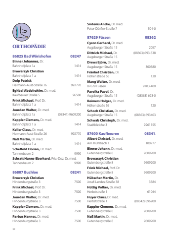 32ORTHOPÄDIE86825 Bad Wörishofen 08247Binner Johannes, Dr. Bahnhofplatz 1a 1414Browarzyk ChristianBahnhofplatz 1 a 1414Dolp PatrickHermann-Aust-Straße 26 992770Eghbal Abdolrahim, Dr. med.Kaufbeurer Straße 5 96580Frink Michael, Prof. Dr. Bahnhofplatz 1 a 1414Jourdan Walter, Dr. med. Bahnhofplatz 1a (08341) 9609200Kappler Clemens, Dr. med. Bahnhofplatz 1 a 1414Keller Claus, Dr. med. Hermann-Aust-Straße 26 992770Naß Martin, Dr. med. Bahnhofplatz 1 a 1414Scheffold Florian, Dr. med. Tannenbaum 2 9990Schratt Hanns-Eberhard, Priv.-Doz. Dr. med. Tannenbaum 2 999086807 Buchloe 08241Browarzyk ChristianHindenburgstraße 3 7500Frink Michael, Prof. Dr. Hindenburgstraße 3 7500Jourdan Walter, Dr. med.Hindenburgstraße 3 7500Kappler Clemens, Dr. med.Hindenburgstraße 3 7500 Parbus Hannes, Dr. med.Hindenburgstraße 3 7500Sintenis Andre, Dr. med. Peter-Dörfler-Straße 7 504-087629 Füssen 08362Cyron Gerhard, Dr. med.Augsburger Straße 15 2057 Dittrich Michael, Dr. (08363) 693-538Augsburger Straße 15 Drews Björn, Dr. med.Augsburger Straße 15 300380 Fränkel Christian, Dr. Höhenstraße 56 120Mang Walter, Dr. med. 87629 Füssen 9103-400Pavelka Pavol, Dr.Augsburger Straße 15 (08363) 693-0Reimers Holger, Dr. med. Höhenstraße 56 120Schoch Christian, Dr. med.Augsburger Straße 15 (08363) 693403Schwab Christoph, Dr. med. Stadtbleiche 3 9261155 87600 Kaufbeuren 08341.Albert Christof, Dr. med.Am Mühlbach 1 100777Binner Johann, Dr. med.Gutenbergstraße 8 9609200 Browarzyk ChristianGutenbergstraße 8 9609200Frink Michael, Prof. Dr. Gutenbergstraße 8 9609200 Hübscher Martin, Dr. Josef-Landes-Straße 38 3384Hüttig Volker, Dr. med.Herbststraße 1 61044 Huyer Claus, Dr. med. Herbststraße 1 (08342) 896900Kappler Clemens, Dr. med.Gutenbergstraße 8 9609200 Naß Martin, Dr. med.Gutenbergstraße 8 9609200