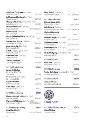 36Indlekofer Christoph, Dipl.-Psych. Allgäuer Straße 25 9633370 Lohbrunner Christine, Dipl.-Psych. Wagnerstraße 2 9271862Mayinger Winfried, Dr. med. Dipl.-Psych. Reichlinstraße 31 9414059 Morgenroth David, Dipl.-Psych. Kramerstraße 34 (0176) 83026786Neyer Regine, Dipl.-Psych. Donaustraße 41 76171Neyer-Weber Eva Maria, Mag. rer. nat. . Donaustraße 41 76171 Riester-Karg Sabine, Dipl.-Psych. Mindelheimer Straße 2 9280939Sander Agathe, Dipl.-Psych. Bahnhofstraße 18 8333531 Schäfer Susanne, Dipl.-Psych. Kramerstraße 34 7569508Schmidt Ulrike, Dipl.-Psych. Kramerstraße 32 9419370Treiber Franziska, Dr.Tummelplatzweg 13 9264623 87719 Mindelheim 08261Jenewein Marion, Dr. rer. nat. Dipl.-Psych. Steinstraße 2 7370589 Rüegg Claus, Dipl.-Psych. Bahnhofstraße 20 6067705 Ruppel MelanieBahnhofstraße 20 6067705Vogt Birgit, Dipl.-Psych. Maximilianstraße 55 73913287484 Nesselwang 08361Meyer-Lohmann Ulrike, Dipl.-Psych. Lindenstraße 18 9251045 Sigmund-Wild Irene, Dipl.-Psych. M.A.Hammerschmiede 1 (0176) 7278654187634 Obergünzburg 08372Butz Matthias, Dr. Hagenmoos 3 (0176) 83369320Mayr Rudolf, Dipl.-Psych. Strumpfwirkerweg 2 (0171) 385238987724 Ottobeuren 08332Böhme-Kuhnt UlrikeMemminger Straße 31 (0831) 530-0Leix Simone, Dipl.-Psych. Johannes-Gutenberg-Straße 2 (0152) 54229258 Markert AlexandraChristianstraße 7 A 9361351 Michaela Nägele, M.Sc.-Psych.Langenberg 6 1/2 (0163) 1780724Schmidt Clemens, M.Sc. Psych.Bahnhofstraße 9 (0176) 69611923Schmidt Donata, M.Sc. Psych.Bahnhofstraße 9 (0176) 69296991Wirth Wolfgang, Dr. phil. Dipl.-Psych. Luitpoldstraße 6 79009787459 Pfronten 08363Buss Julia, Dipl.-Psych. Kemptener Straße 6 a 925858587645 Schwangau 08362Tenikl Christiane, Dr. rer. nat. Dipl.-Psych. Forggenseestraße 80 930353586842 Türkheim 08245Zickhardt KarinaAlfred-Drexel-Straße 14 9049004 UROLOGIE87730 Bad Grönenbach 08334Künst PhilippSonnenstraße 4 3760821