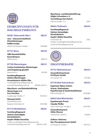 45Maschinen- und Betriebshilfsring Allgäu-Schwaben e. V.Vermittlung: Herz KatrinFellhornstraße 15 a 304786842 Türkheim 08245Familienpflegewerk Station UnterallgäuEinsatzleiterin: Hupfer-Müller RoswithaDorfstraße 40 2907hupfer-mueller@familienpflegewerk.dewww.familienpflegewerk.deERGOTHERAPIE87727 Babenhausen 08333Gesundheitszentrum ProPhysio GmbH Am Espach 20 92790087730 Bad Grönenbach 08334Ergoteam Rabus, Eckert, Ostner, DiefenthalerErgotherapie & HandrehabilitationBahnhofstraße 35 362998486825 Bad Wörishofen 08247Ergotherapie-Praxis Claudia PfefferHans-Holzmann-Straße 6 9979783GesundheitspraxisStiller WernerTürkheimer Straße 5 333854Zellmer Johannes Das Therapiezentrum GmbHSchlingener Straße 3 99733-0 EINRICHTUNGEN FÜR HAUSHALTSHILFEN89281 Altenstadt (Iller) 08337Jura – Hauswirtschaftliche Dienstleistungen Reffler EvelynAlbert-Schweitzer-Straße 1 740586887737 Boos 08335HBK Haushaltshilfen Kesel BarbaraWiesenweg 7 98831887700 Memmingen 08331Caritas Sozialstation Memmingenund Umgebung gGmbHMarienrain 4 924340 Familienpflegewerk Station MemmingenEinsatzleiterin: Müller Elkemueller@familienpflegewerk.dewww.familienpflegewerk.de (08394) 940213Maschinen- und BetriebshilfsringMemmingen e.V.Frei ChristianAugsburger Straße 17 9918310Nimanaj Serife(Sozialbetreuerin)Bergermühlstraße 50 833348687719 Mindelheim 08261Familienpflegewerk Station UnterallgäuEinsatzleiterin: Hupfer-Müller Roswithahupfer-mueller@familienpflegewerk.dewww.familienpflegewerk.de (08245) 2907