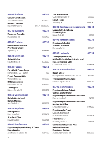 4686807 Buchloe 08241Gerum Christiane F.Schrannenstraße 3 8004100Berkau ChristinaBahnhofstraße 40 (0157) 3083051587740 Buxheim 08331Zembrod CorneliaPappelallee 2 a 929049087746 Erkheim 08336Gesundheitszentrum ProPhysio GmbH Alpenweg 4 813853586833 Ettringen 08249Seifert CarinaStauferstraße 1 265300587629 Füssen 08362Fachklinik EnzensbergHöhenstraße 56, Hopfen 120Praxis Gewusst Wie!Welfenstraße 35 9118926Ritter JosephineReichenstraße 25 9262419Therapy4UBahnhofstraße 12 923198187656 Germaringen 08341Kehrle Gerald undKehrle MartinaAm Riederloh 21 995975987659 Hopferau 08364Enzinger EvaHauptstraße 8 9859401Schubert ElisaHauptstraße 8 985940187600 Kaufbeuren 08341Ergotherapiepraxis Hopp & TeamHopp JessicaJosef-Landes-Straße 38 9087720ZAR KaufbeurenGutenbergstraße 10 999660Schuh HeidiAlleeweg 8 966608087600 Kaufbeuren-Neugablonz 08341Lebenshilfe OstallgäuFrank BrigitteNeue Zeile 23 6876586498 Kettershausen 08333 Ergoteam SchmidtSchmidt MatthiasKirchstraße 10 92641887763 Lautrach 08394 Therapiepraxis Vital,Mürbe Karin, Gallasch Armin undHonold Richard GbROsterriederstraße 25 9258573 87616 Marktoberdorf 08342Bosch OliverGeorg-Friedrich-Händel-Straße 11 899464Therapiezentrum AllgäuEberle-Kögl-Straße 6 915404287700 Memmingen 08331Ergoteam Rabus, Eckert, Ostner, DiefenthalerErgotherapie & HandrehabilitationKramerstraße 42 84327Ergotherapie & Handrehabilitation Mester MatthiasLindentorstraße 12 9744280Ergotherapie-Praxis Liane AckermannMaximilianstraße 4 9415308Filser Birte, GPMachnigstraße 5 963573Gemeinschaftspraxis PfEtHefele Albert undEisenlauer JochenAugsburger Straße 23 8335696