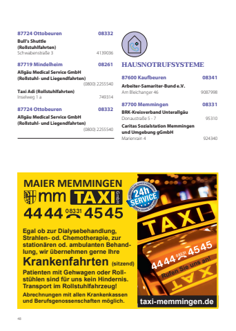 4887724 Ottobeuren 08332Bull’s Shuttle (Rollstuhlfahrten)Schwabenstraße 3 413903687719 Mindelheim 08261Allgäu Medical Service GmbH(Rollstuhl- und Liegendfahrten)(0800) 2255540Taxi Adi (Rollstuhlfahrten)Inselweg 1 a 74931487724 Ottobeuren 08332Allgäu Medical Service GmbH(Rollstuhl- und Liegendfahrten)(0800) 2255540HAUSNOTRUFSYSTEME87600 Kaufbeuren 08341Arbeiter-Samariter-Bund e.V.Am Bleichanger 46 9087998 87700 Memmingen 08331BRK-Kreisverband Unterallgäu Donaustraße 5 - 7 95310Caritas Sozialstation Memmingen und Umgebung gGmbHMarienrain 4 924340MAIER MEMMINGENGmbHtaxi-memmingen.deEgal ob zur Dialysebehandlung,Strahlen- od. Chemotherapie, zur stationären od. ambulanten Behandlung, wir übernehmen gerne IhreKrankenfahrten (sitzend)Patienten mit Gehwagen oder Rollstühlen sind für uns kein Hindernis.Transport im Rollstuhlfahrzeug!Abrechnungen mit allen Krankenkassen und Berufsgenossenschaften möglich.Rufen Sie uns an!