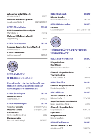 49Johanniter-Unfallhilfe e.V.Altvaterstraße 8 97950Malteser Hilfsdienst gGmbHAugsburger Straße 8 (0821) 258504787719 Mindelheim 08261 BRK-Kreisverband Unterallgäu Mühlstraße 5 7690-0Malteser Hilfsdienst gGmbHZeppelinweg 13 612287724 Ottobeuren 08332 Senioren-Service-Ruf Stock ManfredSchillerstraße 44 93131Caritas OttobeurenAdelgundeweg 3 923740HEBAMMEN (FREIBERUFLICH)Eine aktuelle Liste der freiberuflichen Hebammen im Allgäu finden sie auf www.allgaeuer-hebammen.de.87734 Benningen 08331Daidrich AnnikaAlpenstraße 28 941497887700 Memmingen 08331Tauscher Daniela (01590) 1142178 Maschke Sandra (0151) 51122587Lahode IrinaSiechenreuteweg 3 1/6 3682Zierke AnnetteBruno-Schmidt-Weg 9 985817086833 Siebnach 08249Mögele MonikaMarkt-Walder-Straße 18 96234087785 Winterrieden 08333Keck PiaSonnenstraße 14 (0151) 58164160HÖRGERÄTEAKUSTIKER/HÖRGERÄTE86825 Bad Wörishofen 08247Hörgeräte Baur, Baur StevenHermann-Aust-Straße 4 1276Ohrwerk Hörgeräte GmbHThurner AndreaSt. Anna-Straße 26 395445 86807 Buchloe 08241Ohrwerk Hörgeräte GmbHHindenburgstraße 1 877087629 Füssen 08362A & Ohr GmbH & Co. KGBahnhofstraße 12 9234300Amplifon Deutschland GmbHKaiser-Maximilian-Platz 4 37097Ohrwerk Hörgeräte GmbHLuitpoldstraße 21 9391210Optik Matt – HörgeräteakustikReichenstraße 24 94073087600 Kaufbeuren 08341A & Ohr GmbH & Co. KGAlte Weberei 12 9080536