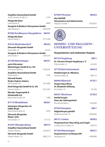 50Amplifon Deutschland GmbHJosef-Landes-Straße 21 3194Hörgeräte BaurLedergasse 8 8808Zengerle & Riederer Hörsysteme GmbHAlte Weberei 2 999359087600 Kaufbeuren-Neugablonz 08341Hörgeräte BaurNeuer Markt 9 971336087616 Marktoberdorf 08342Ohrwerk Hörgeräte GmbHSalzstraße 19 95355Zengerle & Riederer Hörsysteme GmbHJahnstraße 7 420323087700 Memmingen 08331auric Hörcenter Memmingen GmbH & Co. KG Schrannenplatz 6 8336335Amplifon Deutschland GmbHWeinmarkt 4 5595Hörwelt NuskoNusko Hubert JohannKalchstraße 39 9413068Kind Hörgeräte GmbH & Co. KG Herrenstraße 2 8337267Mendes Augenoptik & Hörakustik e.K. Maximilianstraße 24 238987719 Mindelheim 08261Hartmann Hörgeräte e.K. Gäble BirgitMaximilianstraße 43 8350Ohrwerk Hörgeräte,Mayer JuliaKornstraße 14 73213287634 Obergünzburg 08372Amplifon Deutschland GmbHOberer Markt 6 9238470Ohrwerk Hörgeräte GmbHOberer Markt 1 b 980277487459 Pfronten 08363das labOHR Hörsysteme und GehörschutzAllgäuer Straße 1 9292855HOSPIZ- UND PALLIATIVUNTERSTÜTZUNGHospizzimmer und stationäre Hospize86154 Augsburg 0821St. Vinzenz-Hospiz Augsburg e. V.Zirbelstraße 23 26165087730 Bad Grönenbach 08334Kinderhospiz St. Nikolaus Gerberstraße 28 98911088400 Biberach 07351Hospiz Haus Maria St. Elisabeth-Stiftung Kirchplatz 10 15225089257 Illertissen 07303benlid-hospiz Haus der Geborgenheit Bruckhofstraße 6 164304087439 Kempten 0831AllgäuHospiz gGmbH Madlenerstraße 18 960464088131 Lindau 08382Hospizzentrum Haus Brög zum Engel Ludwig-Kick-Straße 30 94437487700 Memmingen 08331Hospizzimmer im BürgerstiftSpitalgasse 8 4908989