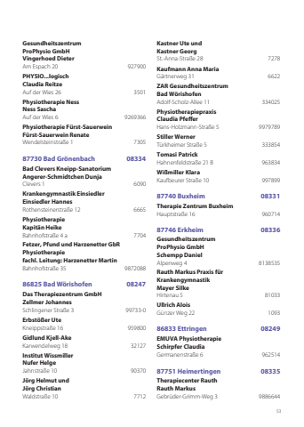 53Gesundheitszentrum ProPhysio GmbHVingerhoed DieterAm Espach 20 927900PHYSIO...logisch Claudia Reitze Auf der Wies 26 3501 Physiotherapie NessNess SaschaAuf der Wies 6 9269366Physiotherapie Fürst-SauerweinFürst-Sauerwein Renate Wendelsteinstraße 1 7305 87730 Bad Grönenbach 08334Bad Clevers Kneipp-SanatoriumAngerer-Schmidtchen DunjaClevers 1 6090Krankengymnastik EinsiedlerEinsiedler HannesRothensteinerstraße 12 6665Physiotherapie Kapitän Heike Bahnhofstraße 4 a 7704Fetzer, Pfund und Harzenetter GbR Physiotherapiefachl. Leitung: Harzenetter MartinBahnhofstraße 35 987208886825 Bad Wörishofen 08247Das Therapiezentrum GmbH Zellmer JohannesSchlingener Straße 3 99733-0Erbstößer Ute Kneippstraße 16 959800Gidlund Kjell-Ake Karwendelweg 18 32127Institut Wissmiller Nufer HelgeJahnstraße 10 90370Jörg Helmut undJörg ChristianWaldstraße 10 7712Kastner Ute undKastner GeorgSt.-Anna-Straße 28 7278Kaufmann Anna MariaGärtnerweg 31 6622ZAR Gesundheitszentrum Bad WörishofenAdolf-Scholz-Allee 11 334025Physiotherapiepraxis Claudia PfefferHans-Holzmann-Straße 5 9979789Stiller WernerTürkheimer Straße 5 333854Tomasi PatrickHahnenfeldstraße 21 B 963834Wißmiller KlaraKaufbeurer Straße 10 99789987740 Buxheim 08331Therapie Zentrum BuxheimHauptstraße 16 96071487746 Erkheim 08336Gesundheitszentrum ProPhysio GmbHSchempp DanielAlpenweg 4 8138535Rauth Markus Praxis für Krankengymnastik Mayer SilkeHirtenau 5 81033Ullrich AloisGünzer Weg 22 109386833 Ettringen 08249EMUVA Physiotherapie Schirpfer ClaudiaGermanenstraße 6 96251487751 Heimertingen 08335Therapiecenter Rauth Rauth MarkusGebrüder-Grimm-Weg 3 9886644