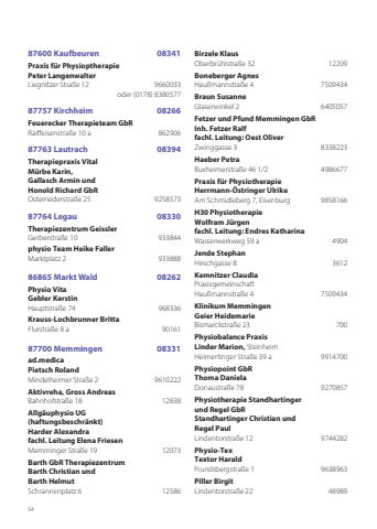 5487600 Kaufbeuren 08341Praxis für PhysioptherapiePeter LangenwalterLiegnitzer Straße 12 9660033oder (0178) 838057787757 Kirchheim 08266Feuerecker Therapieteam GbRRaiffeisenstraße 10 a 86290687763 Lautrach 08394Therapiepraxis VitalMürbe Karin, Gallasch Armin und Honold Richard GbROsterriederstraße 25 925857387764 Legau 08330Therapiezentrum GeisslerGerberstraße 10 933844physio Team Heike FallerMarktplatz 2 93388886865 Markt Wald 08262Physio Vita Gebler KerstinHauptstraße 74 968336Krauss-Lochbrunner BrittaFlurstraße 8 a 9016187700 Memmingen 08331ad.medica Pietsch RolandMindelheimer Straße 2 9610222Aktivreha, Gross AndreasBahnhofstraße 18 12838Allgäuphysio UG (haftungsbeschränkt)Harder Alexandrafachl. Leitung Elena FriesenMemminger Straße 19 12073Barth GbR TherapiezentrumBarth Christian undBarth HelmutSchrannenplatz 6 12586Birzele KlausOberbrühlstraße 32 12209Boneberger AgnesHaußmannstraße 4 7509434Braun SusanneGlaserwinkel 2 6405057Fetzer und Pfund Memmingen GbRInh. Fetzer Ralffachl. Leitung: Oest OliverZwinggasse 3 8338223Haeber PetraBuxheimerstraße 46 1/2 4986677Praxis für PhysiotherapieHerrmann-Östringer UlrikeAm Schmidleberg 7, Eisenburg 9858166H30 PhysiotherapieWolfram Jürgenfachl. Leitung: Endres KatharinaWasserwerkweg 59 a 4904Jende StephanHirschgasse 8 3612Kemnitzer Claudia PraxisgemeinschaftHaußmannstraße 4 7509434Klinikum MemmingenGeier HeidemarieBismarckstraße 23 700Physiobalance PraxisLinder Marion, SteinheimHeimertinger Straße 39 a 9914700Physiopoint GbRThoma DanielaDonaustraße 78 9270857 Physiotherapie Standhartinger und Regel GbRStandhartinger Christian undRegel PaulLindentorstraße 12 9744282Physio-Tex Textor HaraldFrundsbergstraße 1 9638963Piller BirgitLindentorstraße 22 48989