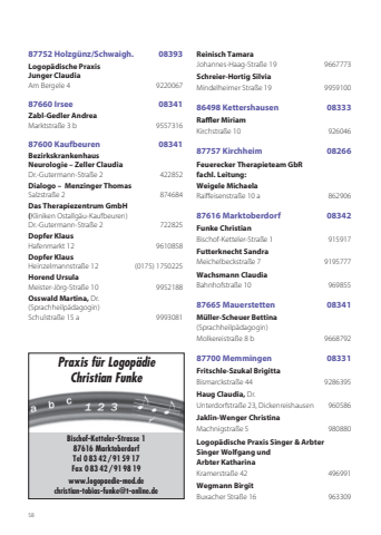 5887752 Holzgünz/Schwaigh. 08393Logopädische PraxisJunger ClaudiaAm Bergele 4 922006787660 Irsee 08341Zabl-Gedler AndreaMarktstraße 3 b 955731687600 Kaufbeuren 08341BezirkskrankenhausNeurologie – Zeller ClaudiaDr.-Gutermann-Straße 2 422852Dialogo – Menzinger ThomasSalzstraße 2 874684Das Therapiezentrum GmbH(Kliniken Ostallgäu-Kaufbeuren) Dr.-Gutermann-Straße 2 722825Dopfer KlausHafenmarkt 12 9610858Dopfer KlausHeinzelmannstraße 12 (0175) 1750225Horend UrsulaMeister-Jörg-Straße 10 9952188Osswald Martina, Dr. (Sprachheilpädagogin)Schulstraße 15 a 9993081Reinisch TamaraJohannes-Haag-Straße 19 9667773Schreier-Hortig SilviaMindelheimer Straße 19 995910086498 Kettershausen 08333Raffler MiriamKirchstraße 10 92604687757 Kirchheim 08266Feuerecker Therapieteam GbRfachl. Leitung:Weigele MichaelaRaiffeisenstraße 10 a 86290687616 Marktoberdorf 08342Funke ChristianBischof-Ketteler-Straße 1 915917Futterknecht SandraMeichelbeckstraße 7 9195777Wachsmann ClaudiaBahnhofstraße 10 96985587665 Mauerstetten 08341Müller-Scheuer Bettina(Sprachheilpädagogin)Molkereistraße 8 b 966879287700 Memmingen 08331Fritschle-Szukal BrigittaBismarckstraße 44 9286395Haug Claudia, Dr.Unterdorfstraße 23, Dickenreishausen 960586Jaklin-Wenger ChristinaMachnigstraße 5 980880 Logopädische Praxis Singer & ArbterSinger Wolfgang undArbter KatharinaKramerstraße 42 496991Wegmann BirgitBuxacher Straße 16 963309Bischof-Ketteler-Strasse 187616 MarktoberdorfTel 0 83 42/91 59 17Fax 0 83 42/91 98 19www.logopaedie-mod.dechristian-tobias-funke@t-online.dePraxis für LogopädieChristian Funke