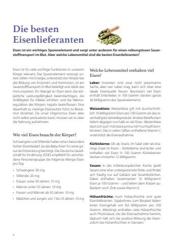 6Eisen ist für viele wichtige Funktionen in unserem Körper relevant. Das Spurenelement versorgt unsere Zellen mit Energie, unterstützt den Körper bei der Bildung von Enzymen und Hormonen, ist am Sauerstofftransport im Blut beteiligt und stärkt das Immunsystem. Ein Mangel an Eisen kann die körperliche Leistungsfähigkeit beeinträchtigen, die Anfälligkeit für Infekte erhöhen und die Wärmeregulation des Körpers negativ beeinflussen. Eine dauerhaft zu niedrige Eisenzufuhr führt zu Blutarmut (Anämie). Da unser Organismus Eisen aber nicht selbst produzieren kann, müssen wir es über die Nahrung aufnehmen.Wie viel Eisen braucht der Körper?Schwangere und Stillende haben einen besonders hohen Eisenbedarf, da das Baby Eisen für seine gesunde Entwicklung benötigt. Die Deutsche Gesellschaft für Ernährung (DGE) empfiehlt für verschiedene Personengruppe die folgende Menge Eisen pro Tag:• Schwangere: 30 mg• Stillende: 20 mg• Frauen unter 50 Jahren: 15 mg• Männer unter 50 Jahren: 10 mg• Frauen und Männer ab 50 Jahren: 10 mg• Mädchen und Jungen von 7 bis 10 Jahren: 10 mgDie besten EisenlieferantenEisen ist ein wichtiges Spurenelement und sorgt unter anderem für einen reibungslosen Sauerstofftransport im Blut. Aber welche Lebensmittel sind die besten Eisenlieferanten?Welche Lebensmittel enthalten viel Eisen?Leber: Innereien sind zwar nicht jedermanns Sache, aber wer Leber mag, kann sich über eine ideale Eisenquelle freuen. Besonders viel Eisen enthält Entenleber, in 100 Gramm stecken ganze 30 Milligramm des Spurenelements.Weizenkleie: Weizenkleie gilt mit durchschnittlich 16 Milligramm Eisen pro 100 Gramm als das eisenhaltigste Getreideprodukt. Andere Kleieflocken liefern dagegen nur halb so viel Eisen. Weizenkleie lässt sich zum Frühstück prima mit Fruchtsaft kombinieren. Das in vielen Säften enthaltene Vitamin C unterstützt die Eisenaufnahme.Kürbiskerne: Ob als Snack, im Salat oder als knackige Zutat im Essen – Kürbiskerne sind lecker und enthalten viel Eisen: In 100 Gramm Kürbiskernen stecken immerhin 12 Milligramm. Sesam: In der mitteleuropäischen Küche spielt Sesam eine eher untergeordnete Rolle und findet sich häufig nur auf Gebäck wie Sesambrötchen. Dabei enthalten Sesamsamen 10 Milligramm Eisen je 100 Gramm – und liefern dem Körper außerdem noch Zink sowie Vitamin E.Hülsenfrüchte: Auch Hülsenfrüchte sind gute Eisenlieferanten. Sojabohnen zum Beispiel haben einen Eisengehalt von 8,6 Milligramm pro 100 Gramm. Allerdings enthalten viele Hülsenfrüchte auch Phytinsäure, die die Eisenaufnahme hemmt, dadurch hält sich die positive Wirkung der Eisenzufuhr bei Hülsenfrüchten in Grenzen.