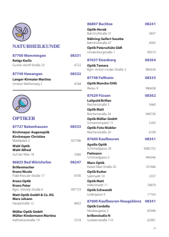 61NATURHEILKUNDE87700 Memmingen 08331Retigs Karlis Gustav-Adolf-Straße 23 672287749 Hawangen 08332 Langer-Kirmaier Martina Unterer Weiherweg 2 6768 OPTIKER87727 Babenhausen 08333Kirchmayer Augenoptik Kirchmayer ChristineMarktplatz 2 927596Wahl Optik Wahl AlfredAuf der Wies 18 336686825 Bad Wörishofen 08247Brillenmacher Krenz NicoleFidel-Kreuzer-Straße 17 8700 Kranz Optik Kranz PeterBgm.-Stöckle-Straße 6 997723Matt Optik GmbH & Co. KGMerz JohannHauptstraße 12 8652Müller Optik GmbH Müller-Kindermann MartinaKathreinerstraße 19 5518 86807 Buchloe 08241Optik-HorakBahnhofstraße 31 5837Nähring-Seifert SusetteBahnhofstraße 47 4992Optik Peterschütz GbRHindenburgstraße 1 9057387637 Eisenberg 08364Optik Tamara Bgm.-Anton-Linder-Straße 2 985634 87748 Fellheim 08335Optik Muncke OHGIllerau 9 98665887629 Füssen 08362Luitpold BrillenReichenstraße 3 5660Optik MattReichenstraße 24 940730Optik Müller GmbHSchrannenplatz 15 5202Optik-Foto NieblerReichenstraße 20 610987600 Kaufbeuren 08341Apollo OptikSchmiedgasse 20 9082752FielmannSchmiedgasse 5 994246Marx OptikKaiser-Max-Straße 20 101666Optik KutterSalzmarkt 10 2357Optik MattHafenmarkt 11 18879Optik SchwandtLedergasse 9 1716387600 Kaufbeuren-Neugablonz 08341Optik CordellaNeubaugasse 2 65046brillenstudio NSudetenstraße 110 62901