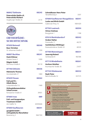 6386842 Türkheim 08245Peterschütz Optik e.K. Peterschütz NorbertAugsburger Straße 20 23 55ORTHOPÄDIESCHUHTECHNIK87650 Baisweil 08340Baur ChristianSt.-Johannes-Straße 3 125986807 Buchloe 08241Hank DittmarHintere Gasse 2 5999Nägele GmbHRot-Kreuz-Straße 4 9011887746 Erkheim 08336 Hämmerle Thomas Günztalstraße 27 1804 87629 Füssen 08362Fuß und Fit – Ulloth MarcoLuitpoldstraße 5 b 7499Orthopädiemanufaktur Schad LorenzKemptener Straße 61 3993187660 Irsee 089Fuß- und Ganganalyse Trautmann GmbHAm Staffel 16 6939360687600 Kaufbeuren 08341gangbild GmbH – orthopädische ManufakturBavariaring 3 9667350Schmidbauer Hans-PeterTänzelfestweg 5 359787600 Kaufbeuren-Neugablonz 08341Lucke und Wirth GmbHGablonzer Ring 16 908182987763 Lautrach 08394 Ortner Andreas Burggässle 1 1768 87616 Marktoberdorf 08342Gruber StefanPoststraße 17 40279Sanitätshaus WittlingerRuderatshofener Straße 29 4053587700 Memmingen 08331 Jauernig RolandGerberplatz 8 982586 87719 Mindelheim 08261Aschner Günther Krumbacher Straße 36 2187787724 Ottobeuren 08332 Rauh Peter Bahnhofstraße 52 937575 fifffflffiflfi ff fflffifflffiflflffifi ffffiflflfi fffflffifi fflfffflfflff fi ffiflfl fflff ffflfffi flfflffiflfflfffi fflffffiflflffiflfl