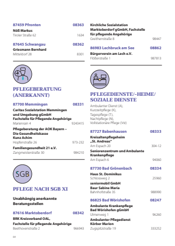 6487459 Pfronten 08363Nöß MarkusTiroler Straße 62 163487645 Schwangau 08362Griesmann BernhardMitteldorf 28 8301PFLEGEBERATUNG (ANERKANNT)87700 Memmingen 08331Caritas Sozialstation Memmingenund Umgebung gGmbHFachstelle für Pflegende AngehörigeMarienrain 4 9243415Pflegeberatung der AOK Bayern – Die GesundheitskasseKunz AchimHopfenstraße 26 973-232Familiengesundheit 21 e.V.Zangmeisterstraße 30 984210PFLEGE NACH SGB XIUnabhängig anerkannte Beratungsstellen87616 Marktoberdorf 08342BRK Kreisverband OAL, Fachstelle für pflegende AngehörigeBeethovenstraße 2 966943Kirchliche Sozialstation Marktoberdorf gGmbH, Fachstelle für pflegende AngehörigeGreitherrstraße 8 9844786983 Lechbruck am See 08862Bürgerverein am Lech e.V.Flößerstraße 1 987813PFLEGEDIENSTE/-HEIME/SOZIALE DIENSTEAmbulanter Dienst (A), Kurzzeitpflege (K), Tagespflege (T), Nachtpflege (N), Vollstationäre Pflege (Vst)87727 Babenhausen 08333Kreisaltenpflegeheim „St. Andreas“Am Espach 20 304-12Seniorenzentrum und Ambulante KrankenpflegeAm Espach 6 9406087730 Bad Grönenbach 08334Haus St. DominikusSchlossweg 2 25960seniormobil GmbH Baur Sabine MariaBahnhofstraße 35 98899086825 Bad Wörishofen 08247Ambulante Krankenpflege Bad Wörishofen gGmbHUlmenweg 1 96260Ambulanter Pflegedienst Körber MarionZugspitzstraße 19 333252