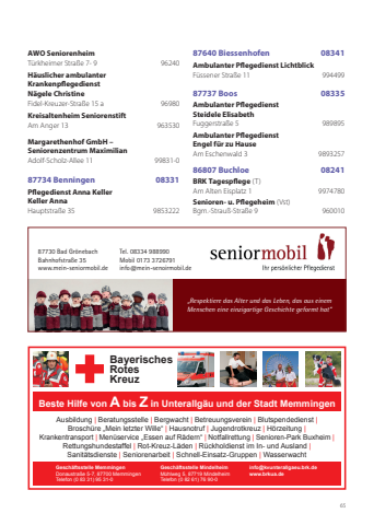65AWO SeniorenheimTürkheimer Straße 7- 9 96240Häuslicher ambulanter Krankenpflegedienst Nägele ChristineFidel-Kreuzer-Straße 15 a 96980Kreisaltenheim SeniorenstiftAm Anger 13 963530Margarethenhof GmbH – Seniorenzentrum MaximilianAdolf-Scholz-Allee 11 99831-087734 Benningen 08331Pflegedienst Anna KellerKeller AnnaHauptstraße 35 985322287640 Biessenhofen 08341Ambulanter Pflegedienst LichtblickFüssener Straße 11 99449987737 Boos 08335Ambulanter Pflegedienst Steidele ElisabethFuggerstraße 5 989895 Ambulanter Pflegedienst Engel für zu HauseAm Eschenwald 3 989325786807 Buchloe 08241BRK Tagespflege (T)Am Alten Eisplatz 1 9974780Senioren- u. Pflegeheim (Vst)Bgm.-Strauß-Straße 9 960010Ausbildung | Beratungsstelle | Bergwacht | Betreuungsverein | Blutspendedienst |Broschüre „Mein letzter Wille“ | Hausnotruf | Jugendrotkreuz | Hörzeitung |Krankentransport | Menüservice „Essen auf Rädern“ | Notfallrettung | Senioren-Park Buxheim |Rettungshundestaffel | Rot-Kreuz-Läden | Rückholdienst im In- und Ausland |Sanitätsdienste | Seniorenarbeit | Schnell-Einsatz-Gruppen | WasserwachtGeschäftsstelle MemmingenDonaustraße 5-7, 87700 MemmingenTelefon (0 83 31) 95 31-0Geschäftsstelle MindelheimMühlweg 5, 87719 MindelheimTelefon (0 82 61) 76 90-0info@kvunterallgaeu.brk.dewww.brkua.deBeste Hilfe von A bis Z in Unterallgäu und der Stadt MemmingenBayerischesRotesKreuz87730 Bad GrönebachBahnhofstraße 35www.mein-seniormobil.de „Respektiere das Alter und das Leben, das aus einem Menschen eine einzigartige Geschichte geformt hat“Tel. 08334 988990Mobil 0173 3726791info@mein-senoirmobil.de