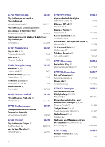 7487700 Memmingen 08331 Physiotherapie ad.medicaPietsch Roland Mindelheimer Straße 2 9610222 Physiotherapie Dreikönigsmühle Boneberger & Kemnitzer GbR Haussmannstraße 5 7509434 Krankengymnastik Wabner & Zehringer Physiotherapie Künergasse 2 9292888 87484 Nesselwang 08361Physio Abt (K, B)Promenadenweg 16 1440Stick Axel (K)Füssener Straße 4 127787634 Obergünzburg 08372Bub Peter (K, M)Unterer Markt 22 7427Heisler Herbert (B, K, M)Oberer Markt 72 1590Hoffmann Verena (K)Kemptener Straße 34 509Peter Beatrice (K)Poststraße 5 92397886869 Oberostendorf 08344Physiotherapie Nieberle (K)Kirchstraße 5 922779787772 Pfaffenhausen 08265 therapieteam feuerecker GbR Feuerecker Cornelia Mindelheimer Straße 9 730989 87666 Pforzen 08346Physiotherapie Geiger (K)Am Moosberg 3 a 9216318van de Ven Mareike (K)Römerstraße 13 92199387459 Pfronten 08363Alpcura Fachklinik AllgäuPeter-Heel-Straße 29 6910Klümper Alfred (M)Vilstalstraße 3 1674Klümper Armin (K)Vilstalstraße 3 927066Koster Bernhard (K, M)Ladehofstraße 5 6779Schuchardt Christoph und Team (K)Vilstalstraße 6 92294St. Vinzenz Klinik (KH)Kirchenweg 15 693342Trinkner Annette (K)Am Lerchenrain 14 9216987671 Ronsberg 08306Lochbihler Jörg (K)Obergünzburger Straße 14 631905287672 Roßhaupten 08367Büchel Sebastian (K)Reichenbergstraße 2 9139754Heyen Iris (K)An der Leiten 26 91321687645 Schwangau 08362Gesundheitszentrum König Ludwig (B, K, M)Kreuzweg 15 889-961Physiotherapie im Kur- und Ferienhaus Schweiger (B, K, M)Füssener Straße 38 81396Steiger Klaus (B, K, M)Frauenbergstraße 52 b, Horn 81067Weiss Robert (K, M)Kreuzweg 24 8335Wellness- und Massagezentrum Dr. Gaschler (Kristalltherme) (K)Am Ehberg 16 930893087637 Seeg 08364Hensen Hermann (B, M, K)Hauptstraße 53 555