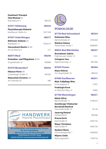 75Handwerk TherapieOtte Michael (K)Rothelebuch 9 98633387677 Stöttwang 08345Physiotherapie NieberleKaufbeurer Straße 8 a 952724887647 Unterthingau 08377Bihlmaier Stefanie (K)Marktplatz 17 9294210Sterzenbach Martin (B, M)An der Breche 9 31786875 Waal 08246Kreisalten- und Pflegeheim (B, M)Singoldstraße 22 96908087679 Westendorf 08344Häusser Horst (M)Gutenberger Straße 57 992930Matuschak Christine (M)Am Salzweg 20 680PODOLOGIE87730 Bad Grönenbach 08334Kohlmaier EllenBahnhofstraße 35 2593204Walcher HelenaHerbisrieder Straße 1 808984586825 Bad Wörishofen 08247Brunnbauer Sabine Fidel-Kreuzer-Straße 14 5551 Schegerer InesAlpenrosenweg 12 906 896 87629 Füssen 08366Klaus Helmut Am Ziegelstadel 18 98832387600 Kaufbeuren 08341Med. Fußpflege Weis Schmiedgasse 9 15307 Podologie Ernst St. Michaels-Weg 10 74802 87700 Memmingen 08331Mösle OliviaBahnhofstraße 13 9746014Gerstberger VitalcenterBerchtold ManfredFraunhoferstraße 10 95130Jauernig RolandGerberplatz 8 982586Krause KarinKalchstraße 47 4905750Mayer ChristianeKalchstraße 47 4905750Neubert MarioHühnerbergstraße 7 9609609Mijares ZaidaMachnigstraße 5 7209756
