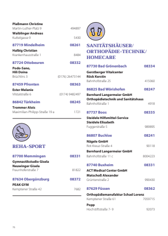 76Plaßmann ChristineMartin-Luther-Platz 9 494897Waiblinger AndreasKuttelgasse 9 543087719 Mindelheim 08261Halbig ChristianKrankenhausstraße 1 848487724 Ottobeuren 08332Podo-Sano, Hili DoinaBrüchlins 3 (0176) 2647314487459 Pfronten 08363Ester MelanieVilstalstraße 6 (0174) 948249786842 Türkheim 08245Trommer AloisMaximilian-Philipp-Straße 19 a 1721 REHA-SPORT87700 Memmingen 08331Gymnastikstudio Gisela Neuwinger GiselaFraunhoferstraße 7 8182287634 Obergünzburg 08372 PEAK GYM Kemptener Straße 42 7682 SANITÄTSHÄUSER/ORTHOPÄDIE-TECHNIK/HOMECARE87730 Bad Grönenbach 08334Gerstberger Vitalcenter Röck KerstinBahnhofstraße 25 41506086825 Bad Wörishofen 08247Bernhard Langermeier GmbHOrthopädietechnik und SanitätshausBahnhofstraße 1 491887737 Boos 08335Steidele Hilfsmittel-Service Steidele ElisabethFuggerstraße 5 98989586807 Buchloe 08241Nägele GmbHRot-Kreuz-Straße 4 90118Bernhard Langermeier GmbHBahnhofstraße 11 c 800422387740 Buxheim 08331ACT Medical Center GmbHMatschoß AlexanderGrüntenstraße 2 99043087629 Füssen 08362Orthopädiemanufaktur Schad LorenzKemptener Straße 61 7059715PoppHochstiftstraße 7- 9 92073