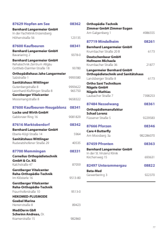 7787629 Hopfen am See 08362Bernhard Langermeier GmbHIn der Fachklinik EnzensbergHöhenstraße 56 12313587600 Kaufbeuren 08341Bernhard Langermeier GmbHBavariaring 2 9378-0Bernhard Langermeier GmbHRehatechnik Zentrum AllgäuGottlieb-Daimler-Straße 18 93780Orthopädiehaus Jahe LangermeierSalzstraße 1 9993580Sanitätshaus WittlingerGutenbergstraße 8 9993622Leonhard-Kluftinger-Straße 8 965750Gerstberger VitalcenterMoosmangstraße 8 965832287600 Kaufbeuren-Neugablonz 08341Lucke und Wirth GmbHGablonzer Ring 16 908182987616 Marktoberdorf 08342Bernhard Langermeier GmbHEberle-Kögl-Straße 14 5964Sanitätshaus WittlingerRuderatshofener Straße 29 4053587700 Memmingen 08331Cornelius Orthopädietechnik GmbH & Co. KGKalchstraße 47 87059Gerstberger Vitalcenter Reha-Orthopädie-Technik Im Klösterle 16 9513-80Gerstberger Vitalcenter Reha-Orthopädie-TechnikFraunhoferstraße 10 9513-0HEKOMED-PLUSMODEGoebel MarinaHerrenstraße 8 89423MediDerm GbRSchwinn Andreas, Dr.Kramerstraße 15 982860Orthopädie-Technik Zimmer GmbH Zimmer EugenAm Galgenberg 1 4986555 87719 Mindelheim 08261Bernhard Langermeier GmbHKrumbacher Straße 20 B 6173Deutschenbaur GmbHHofmann MichaelaKrumbacher Straße 36 21877Langermeier Bernhard GmbHOrthopädietechnik und SanitätshausLandsberger Straße 8 6173Ortho Sani Technikum Nägele GmbHNägele MathiasLaubacher Straße 7 739825387484 Nesselwang 08361Orthopädiemanufaktur Schad LorenzFüssener Straße 5 922958387666 Pforzen 08346Care 4 ButterflyAm Moosberg 3a 98228607087459 Pfronten 08363Bernhard Langermeier GmbHIn der St. Vinzenz KlinikKirchenweg 15 69363182497 Unterammergau 08822 Beta-MedGewerbering 3 922370