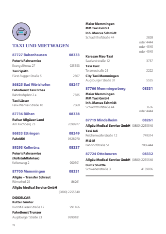 78TAXI UND MIETWAGEN87727 Babenhausen 08333 Peter’s FahrserviceEvangelikreuz 27 925553Taxi SpäthFürst-Fugger-Straße 5 280786825 Bad Wörishofen 08247Fahrdienst Taxi ErbasBahnhofsplatz 2 a 7585Taxi LässerFelix-Wankel-Straße 10 286087736 Böhen 08338Rufcar Allgäuer LandAm Kirchberg 23 269997786833 Ettringen 08249FahrMit! 962897089293 Kellmünz 08337Peter’s Fahrservice(Rollstuhlfahrten)Keltenweg 2 90010187700 Memmingen 08331Allgäu – Transfer Schraut Römerhof 25 86261Allgäu Medical Service GmbH(0800) 2255540DIDDELCARKutter Günter Rudolf-Diesel-Straße 12 991166 Fahrdienst TrunzerAugsburger Straße 23 9990181Maier MemmingenMM Taxi GmbHInh. Marcus SchmidtSchlachthofstraße 44 2828 oder 4444oder 4545 oder 4545Karacan Mau-TaxiSaarlandstraße 12 3737Taxi KurzTeramostraße 25 2222City Taxi Memmingen Augsburger Straße 31 555587766 Memmingerberg 08331Maier MemmingenMM Taxi GmbHInh. Marcus SchmidtSchlachthofstraße 44 3636 oder 444487719 Mindelheim 08261Allgäu Medical Service GmbH (0800) 2255540Taxi AdiReichenwallerstraße 12 749314M & MBahnhofstraße 51 7086444 87724 Ottobeuren 08332Allgäu Medical Service GmbH (0800) 2255540Bull’s ShuttleSchwabenstraße 3 4139036