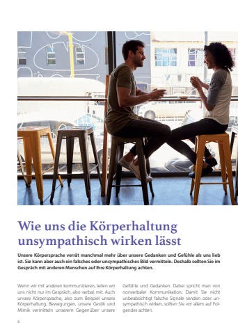 8Wenn wir mit anderen kommunizieren, teilen wir uns nicht nur im Gespräch, also verbal, mit. Auch unsere Körpersprache, also zum Beispiel unsere Körperhaltung, Bewegungen, unsere Gestik und Mimik vermitteln unserem Gegenüber unsere Wie uns die Körperhaltung unsympathisch wirken lässtUnsere Körpersprache verrät manchmal mehr über unsere Gedanken und Gefühle als uns lieb ist. Sie kann aber auch ein falsches oder unsympathisches Bild vermitteln. Deshalb sollten Sie im Gespräch mit anderen Menschen auf Ihre Körperhaltung achten.Gefühle und Gedanken. Dabei spricht man von nonverbaler Kommunikation. Damit Sie nicht unbeabsichtigt falsche Signale senden oder unsympathisch wirken, sollten Sie vor allem auf Folgendes achten.