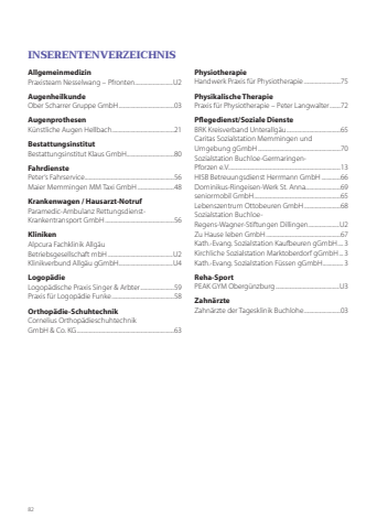 82INSERENTENVERZEICHNISAllgemeinmedizinPraxisteam Nesselwang – Pfronten............................U2AugenheilkundeOber Scharrer Gruppe GmbH.........................................03AugenprothesenKünstliche Augen Hellbach..............................................21BestattungsinstitutBestattungsinstitut Klaus GmbH...................................80FahrdienstePeter‘s Fahrservice..................................................................56Maier Memmingen MM Taxi GmbH...........................48Krankenwagen / Hausarzt-NotrufParamedic-Ambulanz RettungsdienstKrankentransport GmbH...................................................56KlinikenAlpcura Fachklinik Allgäu Betriebsgesellschaft mbH................................................U2Klinikverbund Allgäu gGmbH........................................U4LogopädieLogopädische Praxis Singer & Arbter.........................59Praxis für Logopädie Funke..............................................58Orthopädie-SchuhtechnikCornelius Orthopädieschuhtechnik GmbH & Co. KG........................................................................63PhysiotherapieHandwerk Praxis für Physiotherapie...........................75Physikalische TherapiePraxis für Physiotherapie – Peter Langwalter........72Pflegedienst/Soziale DiensteBRK Kreisverband Unterallgäu........................................65Caritas Sozialstation Memmingen und Umgebung gGmbH.............................................................70Sozialstation Buchloe-GermaringenPforzen e.V...................................................................................13HISB Betreuungsdienst Herrmann GmbH ..............66Dominikus-Ringeisen-Werk St. Anna..........................69seniormobil GmbH................................................................65Lebenszentrum Ottobeuren GmbH...........................68Sozialstation BuchloeRegens-Wagner-Stiftungen Dillingen.......................U2Zu Hause leben GmbH.......................................................67Kath.-Evang. Sozialstation Kaufbeuren gGmbH.... 3 Kirchliche Sozialstation Marktoberdorf gGmbH... 3Kath.-Evang. Sozialstation Füssen gGmbH............... 3Reha-SportPEAK GYM Obergünzburg...............................................U3ZahnärzteZahnärzte der Tagesklinik Buchlohe...........................03