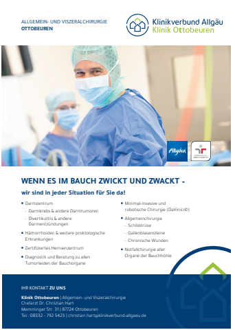ALLGEMEIN- UND VISZERALCHIRURGIEOTTOBEURENWENN ES IM BAUCH ZWICKT UND ZWACKT –wir sind in jeder Situation für Sie da! Darmzentrum- Darmkrebs & andere Darmtumoren- Divertikulitis & andere Darmentzündungen Hämorrhoiden & weitere proktologische Erkrankungen Zertifiziertes Hernienzentrum Diagnostik und Beratung zu allen Tumorleiden der Bauchorgane Minimal-invasive und robotische Chirurgie (DaVinici©) Allgemeinchirurgie- Schilddrüse- Gallenblasensteine- Chronische Wunden Notfallchirurgie aller Organe der BauchhöhleENDOPROTHETIKZENTRUMOTTOBEURENWir bieten Ihnen wohnortnah und in persönlicher Betreuung:Hohes Maß an Spezialisierungund KompetenzArbeit nach vorgegebenenBehandlungspfadenAusführlicheBeratungVergleich unserer Behandlungsdaten mit der Behandlungsqualität anderer ZentrenRegelmäßigeFortbildungenJährliche Überprüfung undBestätigung des Zertifi katsIHR KONTAKT ZU UNSKreisklinik Ottobeuren | EndoProthetikZentrum OttobeurenAbteilung für Unfallchirurgie und OrthopädieChefarzt Dr. med. Tilman EßlingerMemminger Str. 31 | 87724 OttobeurenTel.: 08332 792 – 5423 | E-Mail: chirurgie@kreisklinik-ottobeuren.deIHR KONTAKT ZU UNSKlinik Ottobeuren | Allgemein- und ViszeralchirurgieChefarzt Dr. Christian HartMemminger Str. 31 | 87724 OttobeurenTel.: 08332 – 792 5423 | christian.hart@klinikverbund-allgaeu.de